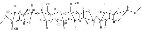 β-glucan is the main active ingredient in highland barley, and its content is about three to nine times higher than in oat and barley [4]. It has three significant functions, namely regulating blood sugar, lowering blood cholesterol, and improving immunity, and is a potential raw functional material for food industry [5,6,7]. The β-glucan molecule, with a specific helical structure, consists of some cellotrioses or cellotetraoses by β-1,4-glycosidic bonds, and these fiber glycosyls are connected each other by β-1,3-glycosidic bonds. The molecular structure of β-glucan is shown in Figure 1.