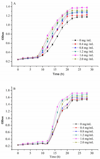 R2 was 0.9944 for Bifidobacterium adolescentis. Specifically, the effects of the addition of GE with different concentrations of 0–2.0 mg/mL on the growth of Lactobacillus bulgaricus and Bifidobacterium adolescentis are shown in Figure 2A,B. The strains biomass and growth rate of the two probiotics increased with GE concentration. When the culture time reached 22 h, the OD600 with adding 1.6 mg/mL GE to Lactobacillus bulgaricus was 1.370 ± 0.017, while the OD600 without adding any GE was only 1.141 ± 0.026 (p < 0.05). Similarly, the OD600 with adding 1.6 mg/mL GE to Bifidobacterium adolescentis was 1.718 ± 0.028, while the OD600 without the addition of GE was only 1.506 ± 0.019 (p < 0.05). Hence, the addition of GE could effectively boost the strains biomass of Lactobacillus bulgaricus and Bifidobacterium adolescentis at the same time.