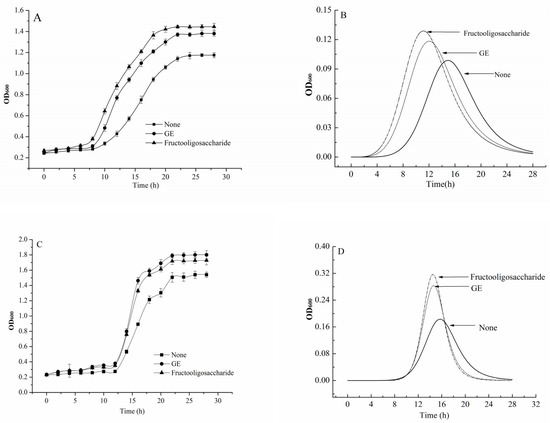 Fructooligosaccharide is commonly regarded as an excellent prebiotic factor, so it was chosen in our study to compare with GE on the ability of improving the growth of Lactobacillus bulgaricus and Bifidobacterium adolescentis [24], and the results were shown in Figure 3A,C.