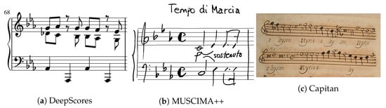 - Capitan: Capitan consists of 46 fully-annotated pages in Spanish mensural notation from the 16th–18th century. The manuscripts represent sacred music, composed for vocal interpretation. The compositions were written in music books by different copyists of that time. To preserve the integrity of the physical sources, images of the manuscripts were taken with a camera instead of scanning them in a flatbed scanner, leading to suboptimal conditions in some cases. The corpus is based on the dataset used in the work of Pacha and Calvo-Zaragoza [24]. However, the refined version used in this work is focused on obtaining a diplomatic transcript, keeping the information of how symbols were written in the source as intact as possible. That is why there is a higher number of categories, since now symbols that have the same meaning—for example, a minima with the stem pointing up or down—are considered as different categories.