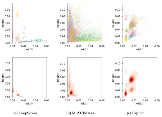 It is important to mention the variability in the aspects of the bounding boxes of the elements within these datasets. This variability appears not only amongst elements of different classes but also, especially in the case of handwritten notation, amongst elements of the same class. To illustrate this scenario, Figure 4 shows the different shapes of the boxes to be recognized in each dataset. The majority of objects in the DeepScores dataset are very tiny. The MUSCIMA++ dataset shows a greater variation in aspect ratios with one dominant cluster, the noteheads. In addition, the Capitan dataset contains a significant number of bigger objects, compared to the other two datasets with distinct clusters.