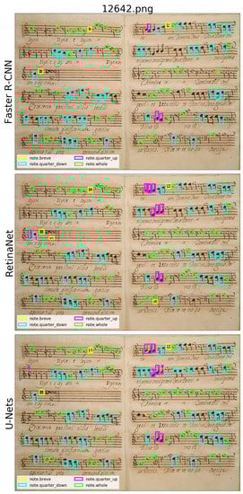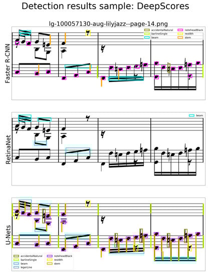 Detection sample on some selected classes from the DeepScores dataset. (top–bottom): Faster R-CNN, RetinaNet, and U-Nets detection results.