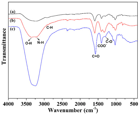 In order to confirm whether melamine and sodium alginate were successfully linked, we measured and compared the infrared spectra of sodium alginate, Alg-Mel hybrid and Pb2+-loaded Alg-Mel. As can be seen in Figure 2, the broad adsorption peak at 3371 cm−1 belongs to the νO–H vibration. The weak adsorption peak at 2919 cm−1 was attributed to the aliphatic C–H stretching vibration. The adsorption peaks at 1591 and 1329 cm−1 belong to C=O and C–O, respectively [10,11]. When compared with the infrared spectrum of raw sodium alginate, there is a new adsorption peak of N–H stretching vibration at 3217 cm−1 in the spectra of Alg-Mel and Pb2+-loaded Alg-Mel, which confirms that melamine was successfully linked with alginate. Moreover, after loading Pb2+, the COO− (carboxylate) peak of the Alg-Mel shifted from 1329 to 1294 cm−1, which might be caused by the coordination of the carboxylate groups with the Pb2+ [12,13].