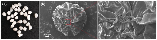 (a) Digital photo of Alg-Mel; (b) SEM image of Alg-Mel at low magnification; (c) SEM image of Alg-Mel at high magnification.