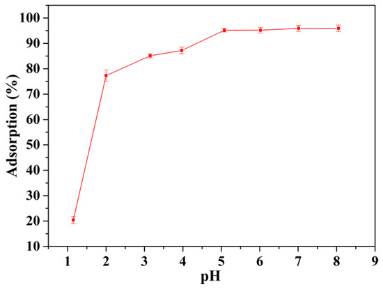 First, Alg-Mel sorbent (about 100 mg) was added into 40 mL of 0.48 mM the Pb2+ solution with different pH values (range from 1 to 8), stirred at room temperature (25 °C) for 6 h, filtered, and then the amount of unadsorbed Pb2+ in the filtrate was measured by ICP-OES. As shown in Figure 4, the influence of pH on the adsorption capacity of Alg-Mel can be divided into three stages: (1) when the pH value of the solution is less than 1, the Alg-Mel can only adsorb less than 25% of Pb2+. This may be due to the pH value being lower than pHpzc (the pHpzc value of Alg-Mel is 1.83), the surface of Alg-Mel is positively charged and exhibits electrostatic repulsion towards Pb2+; (2) when the solution pH in the range of 1–5, the adsorption capacity of Alg-Mel for Pb2+ increases rapidly with increasing of pH. This can be ascribed to the negative surface charge (when the pH value is higher than pHpzc) and strong chelating groups on the surface of the Alg-Mel; (3) when the solution pH is in the range of 5–8, the adsorption capacity of Alg-Mel remains stable. On another hand, according to the rule of solubility product, Pb2+ ions (0.48 mM) will start to form Pb(OH)2 precipitation when the pH value of solution is greater than 5.74. Therefore, we suggest that the optimal adsorption condition for the Alg-Mel is the solution pH in the range of 5–5.74. Within this range, neither the amino group is protonated nor Pb2+ ions are precipitated. Therefore, pH 5.0 of the metal solution was chosen for the adsorption experiment in this study.