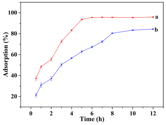 The effect of adsorption time on the adsorption capacity of Alg-Mel was also evaluated with contact time in the range of 0.5–12 h under pH 5.0 at room temperature. It can be seen from Figure 5a that the adsorption capacity of the Alg-Mel for Pb2+ increases with the increasing of contact time and then remains stable. More than 95% of Pb2+ was adsorbed onto the Alg-Mel sorbent within 5 h. On another hand, when ~20 mg of Alg-Mel was used for treating 40 mL of 0.48 mM Pb2+ solution, it took more than 12 h for the adsorption to reach equilibrium (Figure 5b).
