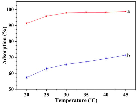 Furthermore, the influence of ambient temperature on adsorption abilities of the Alg-Mel was also studied. It can be seen from Figure 6 that the adsorption ability of the Alg-Mel for Pb2+ increases slowly with the ambient temperature rose from 20 °C to 45 °C, which indicates that the adsorption process is an endothermic process.