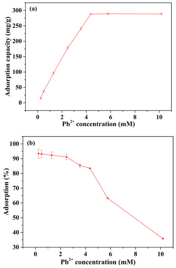 Currently, many methods such as ion exchange, chemical precipitation, electrochemistry, membrane filtration, adsorption and biochemical treatment (bio-adsorption, flocculation, microbial metabolism) have been employed for the removal of Pb2+ from wastewater [3,4,5]. Among these methods, the adsorption method has attracted greater attention due to its simple operation, large processing capacity, can be used repeatedly, and has low-concentration wastewater treatment efficiency (≤10 mg/L). The most widely used adsorbent at present is activated carbon. Activated carbon has high specific surface area and reaction activity, and therefore it can remove lead ions from water. However, the high-quality activated carbon has a high preparation cost and its regeneration process is cumbersome, which limit the large-scale production and applications of activated carbon.