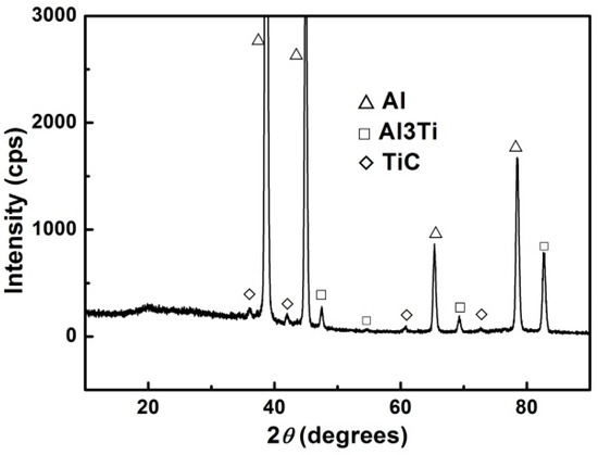 Figure 2 shows the X-ray diffraction of the Al-Ti-C intermediate alloy. The XRD results show that there were Al, Al3Ti, and TiC phases present in the Al-Ti-C intermediate alloy, prepared by the in-situ reaction.