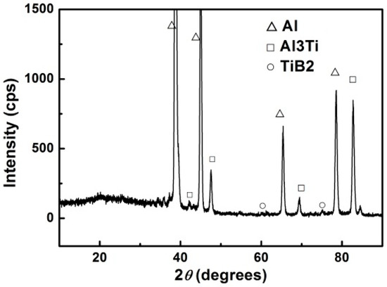 Figure 6 shows the XRD results of Al-Ti-B master alloy. The XRD results showed that there were Al, Al3Ti, and TiB2 phases in the Al-Ti-B intermediate alloy, produced by the in-situ reaction.