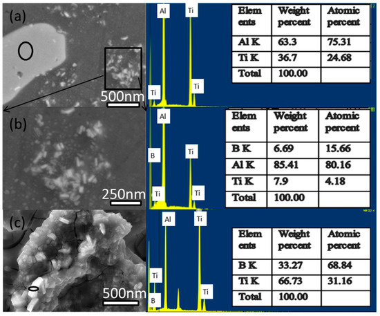 In the early formation stage of the TiC phase, in the high-temperature in situ reaction in the molten alloy, the TiC structure itself contains many C vacancies [34]. This caused instability in the TiC phase structure and poor reinforcement efficiency. According to reports, TiC can degrade rapidly in 30 min. Element B is adjacent to C in the periodic table and has similar properties. In a melt, element B may diffuse and blend into the TiC lattice. This provides a prerequisite for doping with small- sized B atoms, and a way to control the structure and performance of the TiC reinforcement phase. The size of TiC is about 200 nm and the size of TiB2 ranges from 200–900 nm.