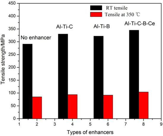 - All three in situ reinforcements were effective to the Al-13Si-4Cu-2Ni-1Mg alloy, and the addition of Al-5Ti-B-C-Ce reinforcement was more effective than the other two reinforcements in increasing the room temperature and high-temperature tensile strength. The RT strength increased by 19.0%, and the 350 °C-strength increased by 18.4%.
