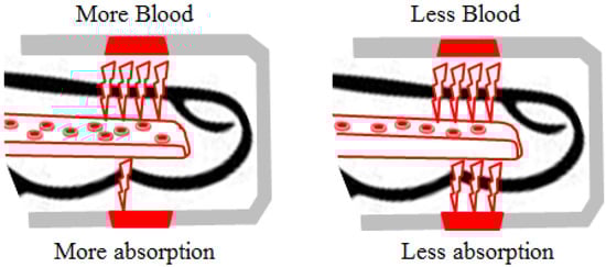Because of their convenience and portability of measurement, PPG-related signals such as PPG and the second derivative of photoplethysmography (SDPPG) signals are widely used for wearable devices [3]. PPG and SDPPG can monitor heart rates and cardiac cycles by optically detecting blood volume changes in the microvascular bed of tissues. The change in volume caused by the pressure pulse is detected by illuminating the skin with the light from an LED (Light emitting diode), and then measuring the amount of light either transmitted or reflected to a photodiode, as shown in Figure 1 (Near infrared light (600–1000 nm) is suitable for PPG measurement because it permeates the skin and is absorbed into hemoglobin [4]. Therefore, a PPG uses an LED that emits near infrared light to the skin.). For example, more blood absorbs more light so that the receiver receives weaker signal strength. Since PPG and SDPPG only use light signals, they are easier and more comfortable to measure than other kinds of bio-signals. Hence various types of wearable devices with PPG have been developed [5]. However, vulnerability to noise is a major drawback of the PPG-related signals.