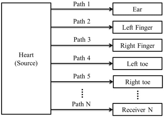SDPPG signals can be measured at multiple locations on body details such as fingers, toes, ears, and wrists even if the heart is the only source. Measuring locations that are independently influenced by movement are chosen since the more independent multipath signals bring the better signal combining performance in wireless communications [18]. For example, two fingers on the same hand may be identically influenced by arm motion and have strongly correlated movement noise. Hence, a toe and a finger, or a finger and an ear would be a better selection to measure SDPPG signals.