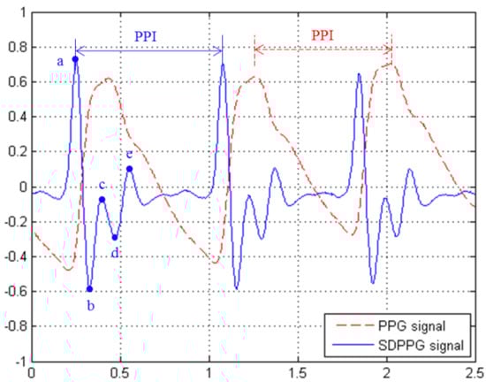 Figure 3 shows the PPG signal and the corresponding SDPPG signal. An SDPPG signal is characterized by the five sequential waves denoted by a, b, c, d, and e in Figure 3, and the wave information is used to detect vascular diseases. For example, an SDPPG aging index, defined as (b-c-d-e)/a, is associated with atherosclerosis in elderly patients [13]. Therefore, SDPPG is considered instead of PPG in this paper, even though the algorithm is also applicable to PPG.