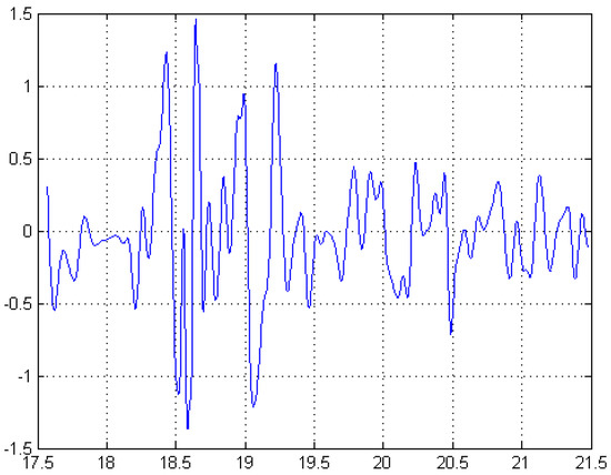Figure 12a shows a measured SDPPG signal with movement noise and Figure 12b,c show A6 and D3 of wavelet transform results, respectively. The algorithm extracts time slots of the pulse waves from the peaks (marked with asterisks) of Figure 12b, and detects movement noise from the power of the detail components of Figure 12d during a slot period. To determine whether movement noise is included in the period, the algorithm computes the SNS of the detail component of level 3 and compares it with a threshold. If the SNS is greater than 1.5, the SDPPG signal in the period contains movement noise; otherwise, the SDPPG signal during the period has no noise. Detection is performed at all channels.