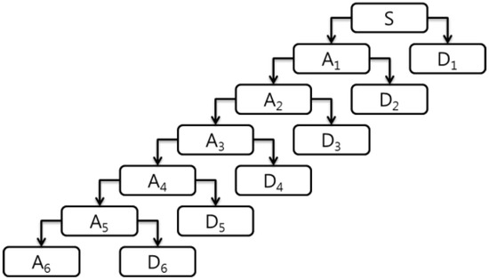 The approximation is repeatedly decomposed into two coefficients, approximation (AN) and detail (DN) coefficients, where N is the decomposition level of wavelet transform, and the outputs are down-sampled by 2. At the level of the transform, the signal is decomposed into low and high frequencies. Figure 6 shows the example of the 6th level wavelet transform and the corresponding equation is expressed as: