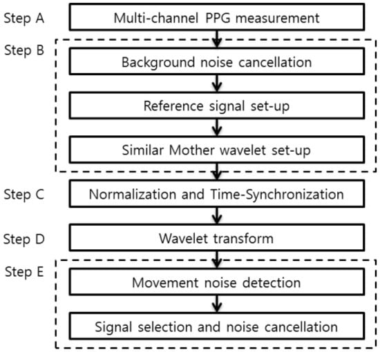 In this paper, an algorithm is proposed to detect movement noise and mitigate the impact of mobility on SDPPG measurement by using multipath signals and the wavelet transform. First, SDPPG signals are measured at different locations on a body, such as fingers and ears, and background noise is removed using a low-pass filter. The algorithm determines a reference signal using the measured SDPPG signals. Time offsets between received signals are aligned in order to compare the measured signals. To determine whether the measured signals include movement noise, the wavelet transform is applied to each signal. Based on the composed signals in the frequency domain, the movement noise is detected and removed. The algorithm procedure is summarized in Figure 7 and the details of each step will be explained in the following subsections.