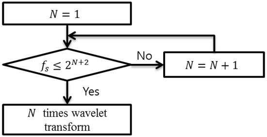 With the selected mother wavelet, the wavelet transform is performed at each channel. As described in Section 3, signals are iteratively decomposed up to level N, which depends on the sampling rate, as in Figure 10. For example, if the sampling rate of an SDPPG signal is 256 Hz, then the level N is set to 6 so that the frequency band of the decomposed approximation components becomes between 0 and 4 Hz [14]. Table 1 shows the frequency band according to the level of the wavelet transform at a 256 Hz sampling rate.