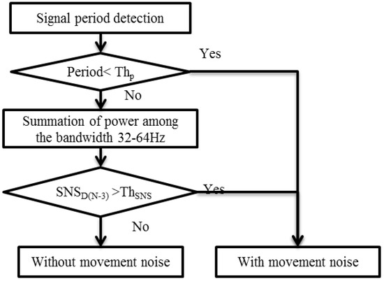 After determining a time slot, to decide whether movement noise exists the algorithm checks whether the period of the time slot is less than a threshold (Thp). In this paper, the threshold is set to 0.3 (In [17], the heart rate is 40–200 beats per minute, which means that the shortest period is 0.3 s.), since the typical heart rate is between 0 and 4 Hz. If the period is less than 0.3 s, i.e., the heart rate is greater than 200 beats per minute, it is decided that the subject is abnormal or the signal is contaminated. If the period of the measured signal is greater than or equal to 0.3 s, the algorithm computes the power of the detail components between 32 and 64 Hz to detect a movement noise.
