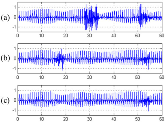 Figure 13 shows an example of removing movement noise by the proposed algorithm in various environments. In cases when only one of two channels has movement noise in the time period between 15 and 35 s, as shown in the Figure 13, the noise is removed at the output signals. In cases when all the channels simultaneously have movement noise in the time period between 45 and 60 s, the noise is reduced, but not entirely removed, by selecting the better signal. When two signals are decided to be clean in the time period between 0 and 15 s, the algorithm selects the better signal among them.