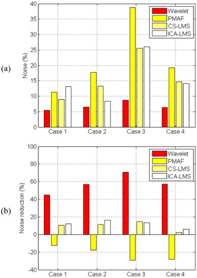 Figure 14 shows the experiment results, which are the average of five person results from each case. The noise at output in Figure 14a is the ratio of time period of SDPPG signals with movement noise after noise cancellation to total experiment time. The noise reduction in Figure 14b is the ratio of reduced time period of a noisy SDPPG signal to the time period in which movement noise was inserted on Channel 1.