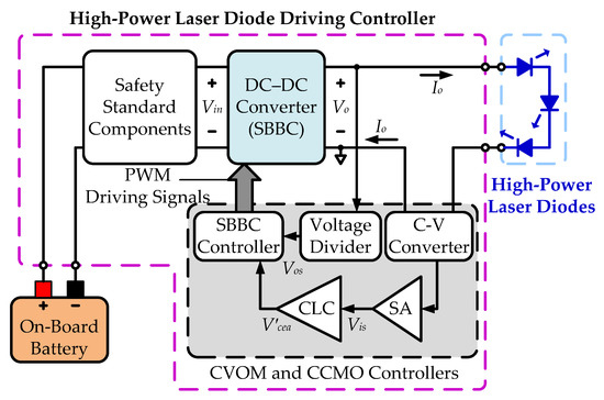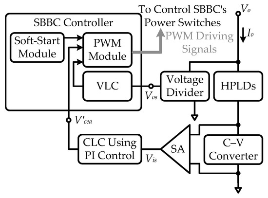 To supply a CV or CC DC-power to drive HPLDs, CVOM and CCOM controllers play a critical role in dominating HPLDDC operations. In Figure 2, CVOM and CCOM controllers comprise a SBBC controller, a C-V converter, a voltage divider, a signal amplifier (SA), and a CLC. As shown in Figure 8, to accomplish the HPLDDC’s CVOM, the voltage divider detects Vo to output a voltage Vos, and then the VLC of SBBC controller can obey Vos to produce an error voltage to manipulate the PWM module. Therefore, the HPLDDC can be controlled in the CVOM to supply the adequate and stable forward voltage driving HPLDs. In addition, in the HPLDDC’s CCOM, the HPLD driving current can be detected by the C-V converter to become a voltage signal, and then the SA can amplify this voltage signal becoming a current detection signal Vis. According to the Vis variation, an error voltage can be produced by the CLC to manipulate the SBBC controller accomplishing the HPLDDC CCOM.