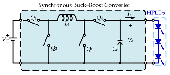 The HPLDDC system configuration is depicted in Figure 2, including the CVOM and CCOM controllers, a DC–DC convertor, and safety standard components. The on-board battery supplies a DC-power to the HPLDDC inlet; the HPLDDC outlet connects three HPLDs in series. To protect the SBBC, CVOM, and CCOM controllers, the SBBC input side must place safety standard components because voltage impulses and spikes or EMI/EMC noises from the battery power bus can be filtered out. In addition, the DC–DC converter topology is the SBBC; an SBBC circuit is shown in Figure 3; this circuit composition includes an output capacitor, Co, power switches, Q1–Q4, and an inductor, L1. Principles and analyses in the buck and boost modes are discussed in the following.