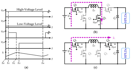In the buck operation, power switches, Q1–Q4, (Figure 3) are replaced with power metal-oxide-semiconductor field-effect transistors (MOSFETs); the synchronous buck circuit with the operating timing is presented in Figure 4. In Figure 4a, vgs1–vgs4 are the MOSFET gate-to-source pulse width modulation (PWM) driving signals, and iL represents the inductor current. When the SBBC input voltage, Vin, is greater than the HPLDDC output voltage, Vo (Vin > Vo), vgs4 is at the high-voltage level, and, consequently, the MOSFET Q4 is always turned on; vgs3 is always at the low-voltage level to turn off the MOSFET Q3. The time intervals, tk0–tk1 and tk2–tk3, are dead times that can prevent MOSFETs Q1 and Q2 from concurrently turning on and becoming a short–circuit. vgs2 is changed to the high-voltage level during the time interval, tk1–tk2, thereby decreasing iL. Figure 4b presents the operating circuit during the time interval, tk0–tk2.