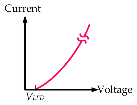 Figure 6 depicts the ideal voltage–current characteristic of LD; VLDF is the forward voltage of LD and a slight current (approximating to no current) flows if the LD driving voltage is lower than VLDF. Without any driving devices to regulate the LD driving current, if the LD driving voltage is higher than VLDF, more current is indispensable to drive the LD strengthening the laser beams, and the driving current can be increased exponentially. Because the constant OOP originates from a stable LD driving current, the LD can be driven by a CC output power supply, or regulated by a CC sink. Several control methods for the LD driving are discussed in the following section.