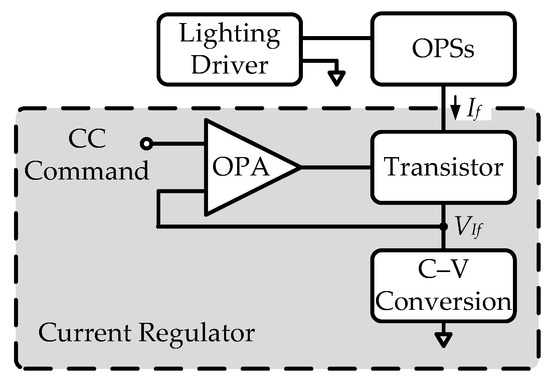 The optoelectronic semiconductor (OPS) including the light-emitting diode (LED), the organic light-emitting diode (OLED), and the LD, should be driven by a CC to obtain a constant OOP or luminance. Figure 7 presents a familiar OPS control circuit that includes the lighting driver, OPSs, and the current regulator (CR). To control the constant driving current in OPSs, a CR comprising an operational amplifier (OPA), a transistor, and a current–voltage (C-V) converter, is the critical circuit because the CR can be considered as a current sink; when the OPS operates in the forward bias, the OPS driving current If sinks into the transistor, and then If can be converted by the C–V converter becoming a voltage VIf; therefore, the transistor can be considered as a variable resistance for adjusting the If because the OPA compares the VIf with a CC command to control the transistor’s operating region [18,19]. However, the CR is unable to address less steady-state errors and sufficient phase margins. Moreover, the lighting driver is a constant-voltage (CV) power source, and although the CC can be achieved using the CR; however, the transistor’s equivalent resistance would cause the power loss and heating. Therefore, the CR is unsuitable for the high-power OPS control.