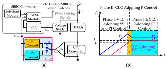 A circuit configuration diagram of CLC using the PIAP control is depicted in Figure 9. In Figure 9b, during Phase I, the HPLDDC is dominated by the VLC and the soft-start module of the SBBC controller, and then Vo can slowly increase to avoid the voltage overshoot occurrence. When the Io increase has reached a current value of I1, a switch, st, (Figure 9a) connects to the position, s1; thus, the CLC can implement P control during Phase II (Figure 9b), hence, the response speed of CLC can be promoted to mitigate the start-up current spike. In Phase III, Io has reached the target CC Icc, the st connects to the position, s2, and then the CLC uses the PI control to regulate the HPLD driving current in the CC state. The aforementioned three CC control methods can be compared and are listed in Table 1.