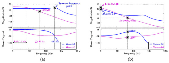 By substituting Equations (16) and (17), and using the MATLAB software, the frequency response to design the CLC for the current loop compensation of HPLDDC can be obtained. Therefore, the HPLDDC requirements for the steady-state operation, including an adequate phase margin, a high low-frequency gain (LFG), and a feasible crossover frequency, can be achieved. The TF of the CLC using the PI control is expressed as follows: