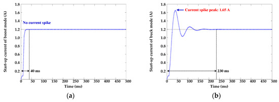 Thus, a CLC using the PIAP control method could be adopted in the HPLDDC. Figure 14 simulations show several benefits: First, the start-up current spike mitigated effectualness. Second, no steady-state errors were achieved, and the final current could address the specified 1.2 A because the HPLDDC using CLC can become the PI control in the SBBC CCOM. Third, the settling time was reduced from 230 to 80 ms in the SBBC buck mode.
