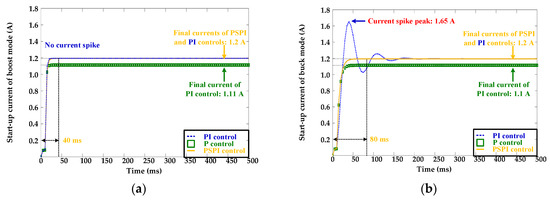To depress the start-up current spike, the CLC using the PIAP control method was employed. Simulations are presented in Figure 14. From Figure 14, despite the SBBC operating mode, the use of P control method cannot achieve the target final current of 1.2 A.