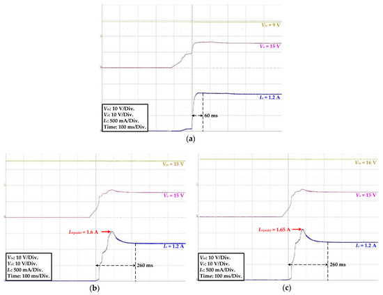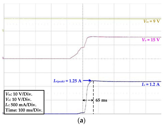 - At a Vin of 16 V, the HPPLD operated in the buck mode because (Vin = 16 V) > (Vo = 15 V), and the current spike was observed, with a peak was 1.65 A. This peak value was also over the HPLD maximum operating current of 1.5 A. Then, the settling time was 260 ms (simulation was 230 ms), as shown in Figure 15c.
