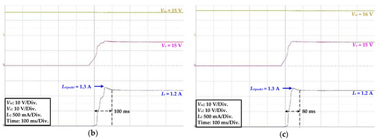 - At a Vin of 15 V, the HPPLD operated in the buck–boost mode, a slight current spike was observed, with a peak of 1.3 A, which was lower than the HPLD maximum operating current of 1.5 A. The settling time was 100 ms, as shown in Figure 16b.
