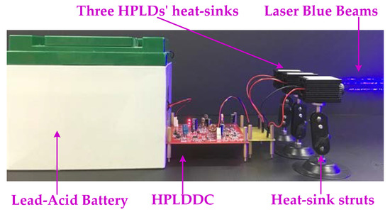 A photograph of the HPLDDC system is presented in Figure 17, including three HPLDs’ heat sinks, three heat-sink struts, a lead-acid battery, and a print circuit board assembly of the HPLDDC. The lead-acid battery could supply to the HPLDDC to drive HPLDs, and then laser blue beams were produced.