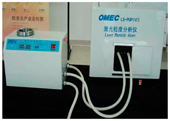 The raw materials used in this study were total tailings, and the moisture content was less than 10% through drying in the open air and a drying oven. Particle size distribution (PSD) of the tailings sample was analyzed using a LS-POP (VI) powerful laser diffraction particle sizer (Figure 1) under dry conditions appropriate for the ASTM D421 standard procedure [49]. The LS-POP (VI) (OMEC, Zhuhai, China) is a centrifugal particle size analyzer which combines particle sedimentation with photometric detection. Particle sizes can be measured over a very wide range from 2 nm to 500 µm, depending on the particle density, dispersant density, and viscosity. By using a single light source (power 2 mW) and eliminating the requisite for laser switching, one-second measuring intervals can be achieved, allowing for real-time monitoring of the particle size. Sample concentration in the dispersant is lower than 0.01 wt% (differs with sample). Sample particles are settled in any of four modes: The gravimetric sedimentation mode, the centrifugal sedimentation mode, the multi mode (combining gravitational sedimentation and centrifugal sedimentation), and the centrifugal lift mode. The main reasons behind why the centrifugal sedimentation mode is used for PSD analyses are that: (i) it increases the sedimentation speed of fine particles by several orders of magnitude, and (ii) it greatly moderates the effect of Brownian motion.