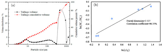 Particle size distribution curve (a) and fractal fitting curve (b) of the tested tailings sample.
