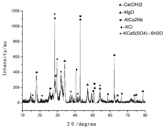 After the calcination process, the mineral components were effectively improved, while the hydration process was facilitated. X-ray diffraction (XRD) of the powder samples was evaluated using a MXP21VAHF diffractometer (MAC Science, Tokyo, Japan) over the range of 10–80 degrees 2θ at a scanning speed of 0.5 deg/min. The tube anode was copper, and the Kα radiation (0.15 nm) was monochromatized with a graphite crystal. The pattern was collected using a tube voltage of 21 kV and a 500 mA tube current. The pattern was scanned by using a step scan mode (step size 0.02 degree, counting time 1 s per step). XRD is a rapid analytical system principally used for the phase identification of a crystalline material. Both XRD and semi-quantitative analyses showed that the sulfur-containing phase in DA was dominated by CaSO3, and its mass fraction reached 10–50%. By contrast, the calcium sulfate content was relatively very small. The result of X-ray diffraction for the tested tailings sample is shown in Figure 3.