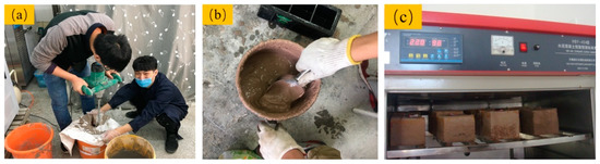 The CTB sample preparation steps: (a) mixing; (b) pouring; and (c) curing.