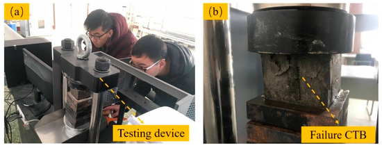 Photos of UCS test device (a) and broken CTB sample after UCS testing (b).