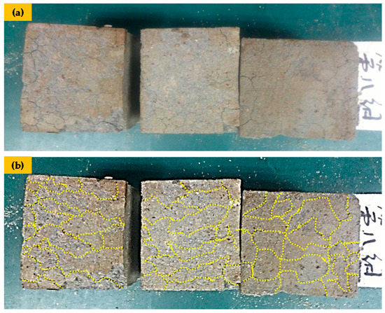 Expansion cracks of DA slag backfill blocks: (a) raw and (b) processed photos.