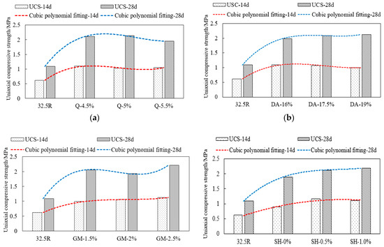 Trend line of the mechanical strength acquisition of CTB samples with different excitation agents: (a) quicklime (Q); (b) desulfurized ash (DA); (c) glauberite mineral (GM); and (d) sodium hydroxide (SH).