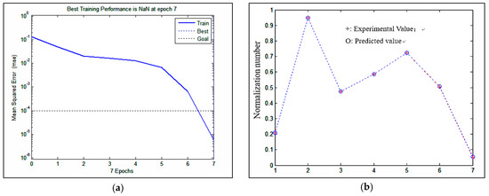 The experimental data of the DA formulation (as shown in Table 2) and normalization theory demonstrated that the input layer data were first normalized to the interval [0, 1], and the output layer data were normalized to the interval [0.05, 0.95]. These values created a certain growth space for the predicted results. Two groups of DA-8 and DA-9 were used as test samples, and the other seven groups were used as training samples. The hidden layer’s neural transfer function was the non-linear Tansig function, and the output layer’s neuron transfer function was the Logsig function. The learning efficiency was 0.05, the maximum number of training was equal to 1000, and the minimum mean square error was 10−8. The number of hidden layer nodes in this model was (3–9) based on the implicit layer and node number theory. The neural network model after training and learning by the Matlab software was used to predict the untrained test samples. The predicted value was compared with the experimental value. When the error value was less than 5%, the established neural network model was considered to meet the requirements; otherwise, the training of the learning sample was continued. Finally, the model with the fastest error convergence curve and smallest prediction error was selected. Figure 8 shows the convergence curve of the neural network training error and the sample function fitting curve. Table 5 shows a summary of the experimental values and predicted values.