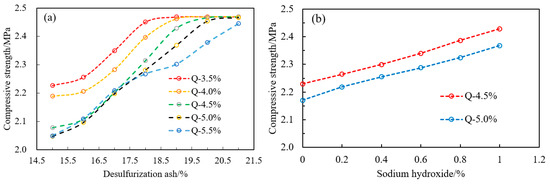 As Figure 7a shows, when the Q content increased from 4.5 to 5.5%, the strength acquisition of 14-day cured CTB sample was influenced by the hydration reaction sequence of the cementitious material used, showing an initial decrease and subsequent increase. Besides, the strength acquisition of 28-day cured CTB slightly increased and then decreased. As shown in Figure 7b, when the DA content increased from 16 to 19%, the strength acquisition of 14-day cured CTB sample gradually decreased and the strength acquisition of 28-day cured CTB sample gradually increased. Given that DA has retardation characteristics, the initial condensation reaction of the whole tailings slurry slowed down, and the early strength acquisition of CTB samples was seriously affected. However, the long-term strength effect was not evident.