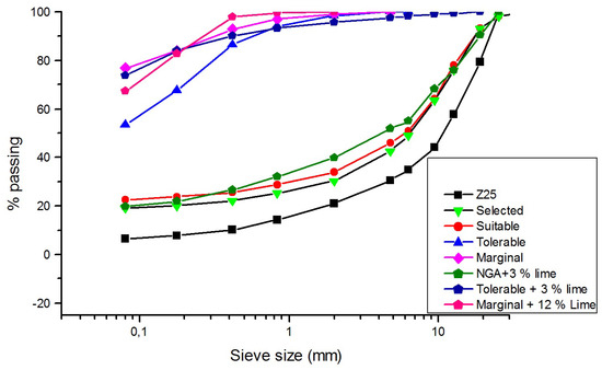 Grading tests were performed according to UNE-EN 933-1/A1 [12]. The procedure followed involved sequential sieving using ISO-standard sieves. The samples were oven-dried at °C prior to the sieving process. The grading curves for the classified soils and some of the stabilized soils prepared are shown in Figure 1. All samples fall within the limits corresponding to their specific range, as defined in the PG-3. The samples representing Z25, selected, suitable and NGA stabilized with lime can be considered as continuous distribution of course grained unbound materials (more than retained on or above No.200 (0.075 mm) sieve), whereas the tolerable and marginal soils, with or without filler, are considered to be fine grained soils (more than passes No.200 sieve), as expected.