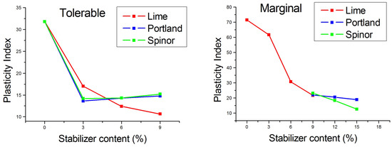 Soil stabilization by lime or hydraulic binder immediately produce a variation of the water content and modification of the geotechnical characteristics of the fine fraction, as due to the flocculation of the clayey fraction of the soil [14,15]. Figure 2 displays the plasticity index for different filler proportions in the stabilized soils prepared in this study. With the addition of lime, the plasticity of both tolerable and marginal soil was reduced, as previously reported by Croft [16]. The addition of cement and microcement produced similar effects in the marginal soils tested: the plasticity index was reduced. However, both hydraulic binders caused an appreciable decrease in plasticity index (from to at the addition of stabilizer in tolerable soil) followed by gradual increase with further additions ( and ).