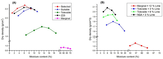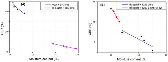 CBR versus moisture content for (A) NGA and tolerable soils stabilized with lime, and (B) marginal soil stabilized with lime and microcement.